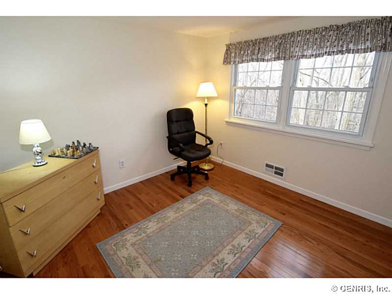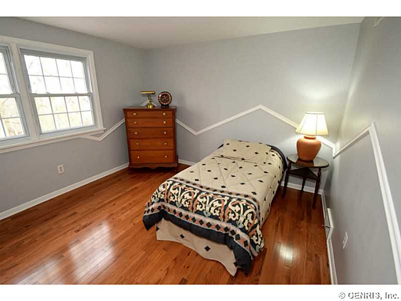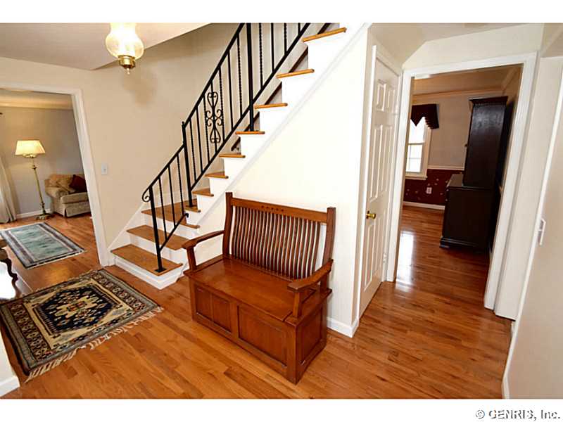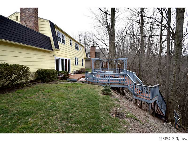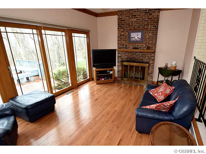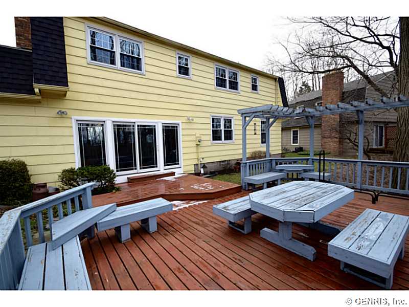O'Brien built colonial priced to sell!! Freshly painted with today's latest colors! BRAND NEW: hardwoods, garage door and sliders to deck. Other updates include: tear off roof-3 years, replacement windows, glass block windows, HVAC, kitchen counter top, more! Spacious rooms throughout, bright, open Kitchen/Fam Rm combo. 1st floor 1/2 ba. Multi level deck overlooking gorgeous wooded lot. Finished basement, great storage and workshop. Popular neighborhood with community pool and play ground. Walking trail from backyard. Fairport elec: $73/mo. RGE:$125/mo. Hurry!
