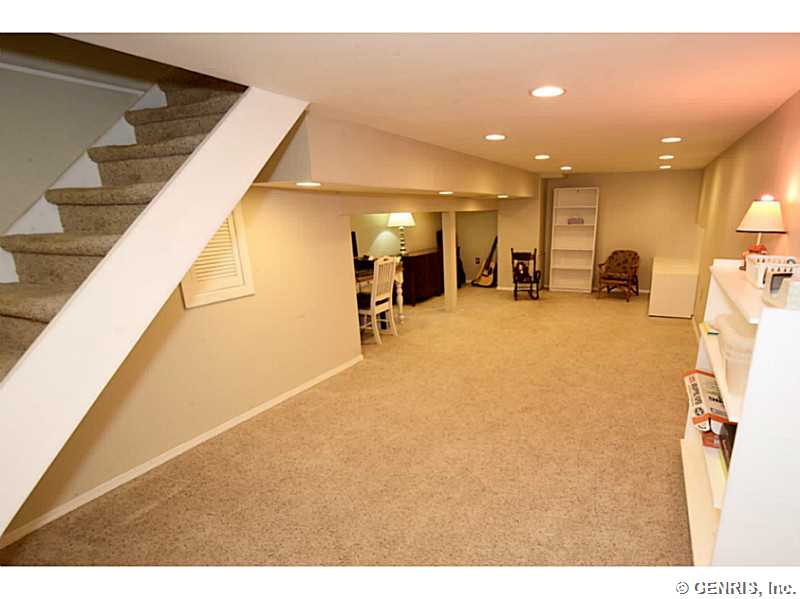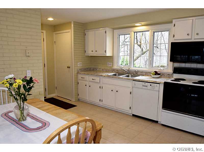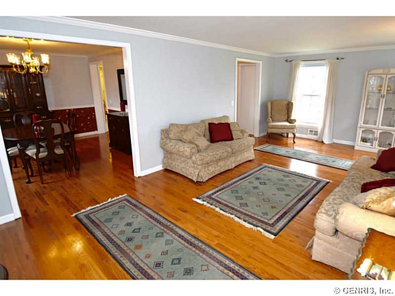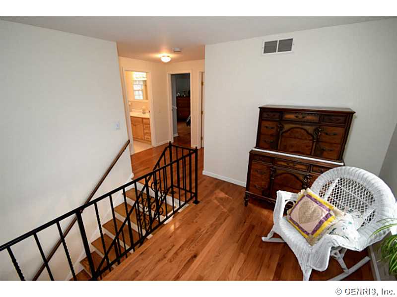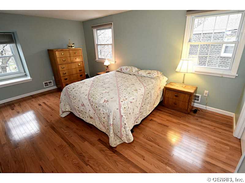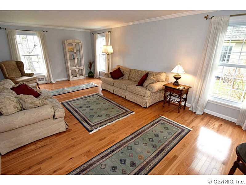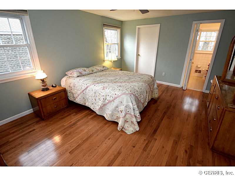 O'Brien built colonial priced to sell!! Freshly painted with today's latest colors! BRAND NEW: hardwoods, garage door and sliders to deck. Other updates include: tear off roof-3 years, replacement windows, glass block windows, HVAC, kitchen counter top, more! Spacious rooms throughout, bright, open Kitchen/Fam Rm combo. 1st floor 1/2 ba. Multi level deck overlooking gorgeous wooded lot. Finished basement, great storage and workshop. Popular neighborhood with community pool and play ground. Walking trail from backyard. Fairport elec: $73/mo. RGE:$125/mo. Hurry!