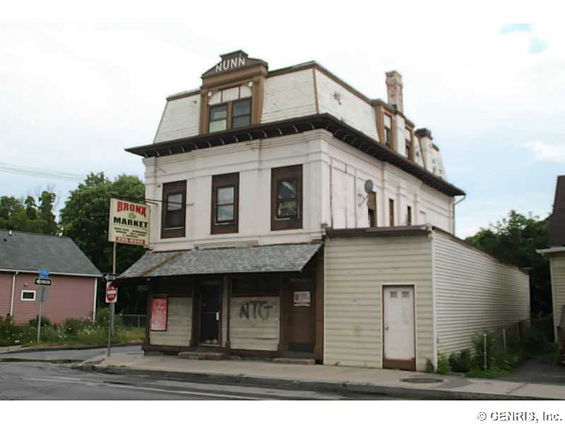 Antique brick structure is neighborhood anchor. Slate mansard roof. Street-level storefront with separate entrance to adjacent office section. Two apartments, on 2nd & 3rd floors. Solid brick bldg requires major interior work and some exterior work. Garage in rear useful for loading/unloading merchandise out of the elements. Clean neighborhood features many newly built homes as well as Susan B Anthony House Museum & Visitor Center. Shown by appointment.