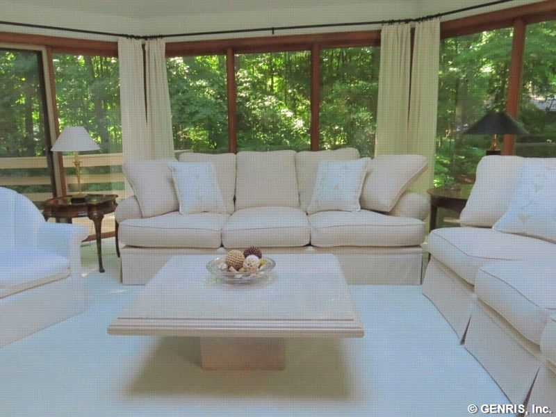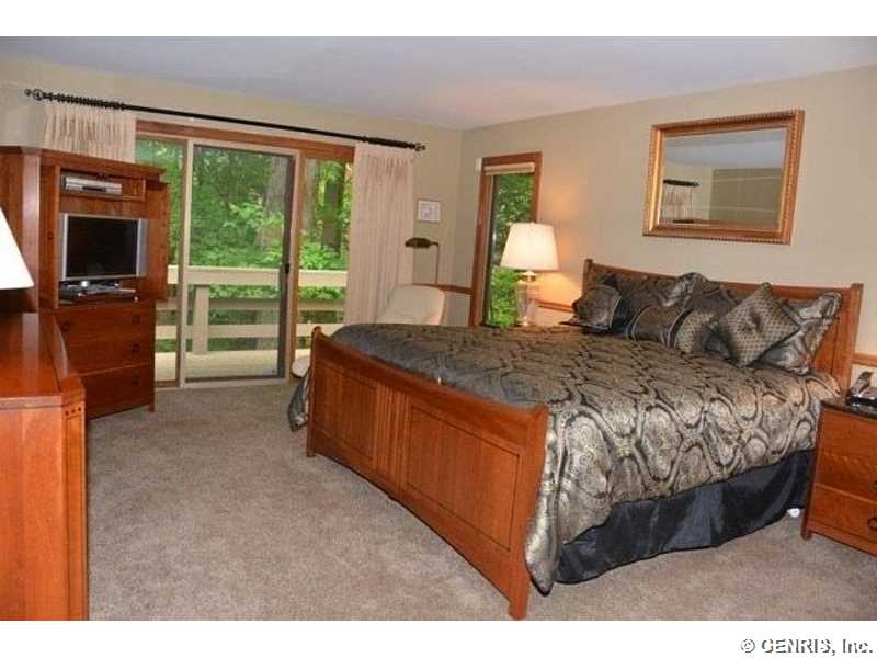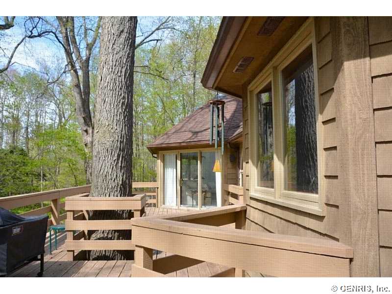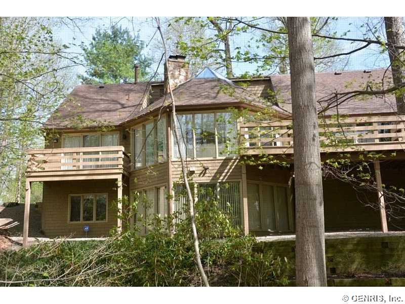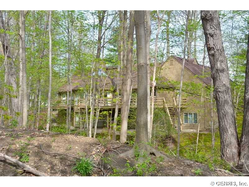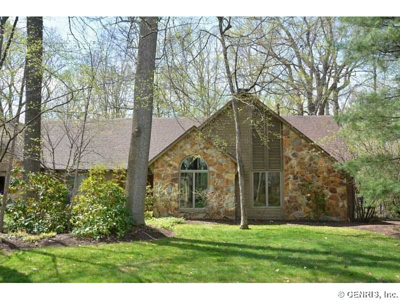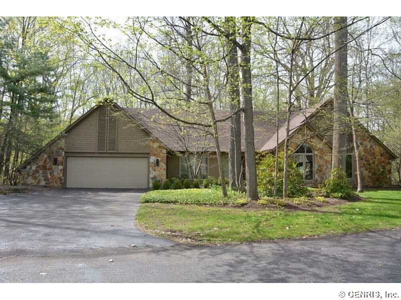 This unique home's architect is James Johnson, the architect for the Mushroom House in Perinton. A private road brings you to this cedar and stone ranch that has an additional 2488 sq ft on the terrace level (home total of 4278 sq ft), including a family room and 4 bedrooms. Tear off roof in 2010, 2 gas furnaces and air conditioner replaced in 2000. Updated kitchen appliances, 2013 home security system, and floor to ceiling windows! A 1st floor master bedroom with a private deck to enjoy the solitude. Living room has an octagonal skylight updated in 2014 and the kitchen is a cook's dream!